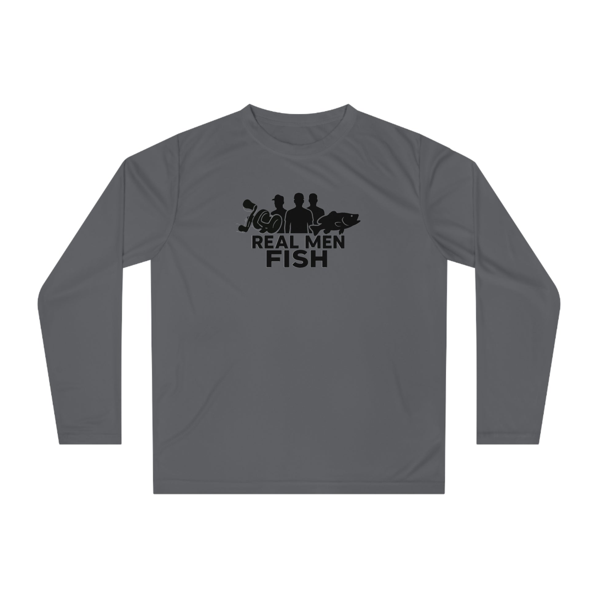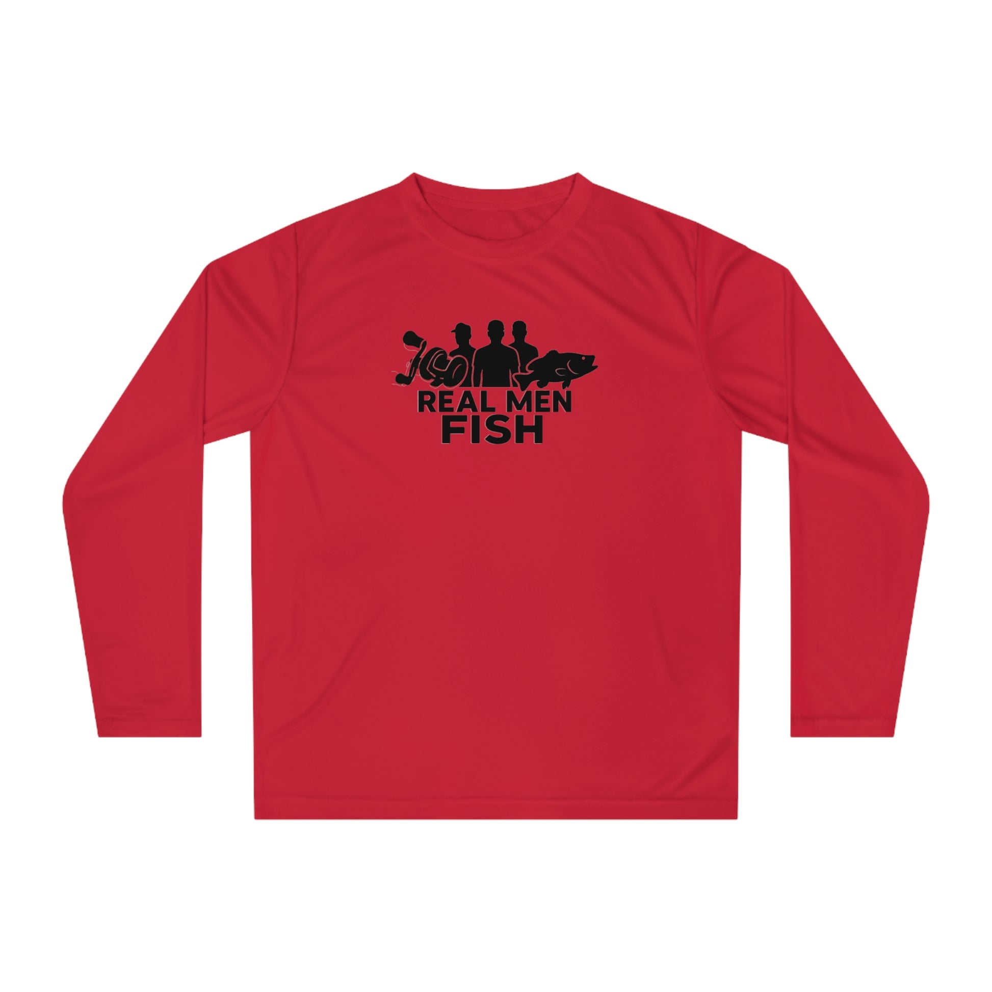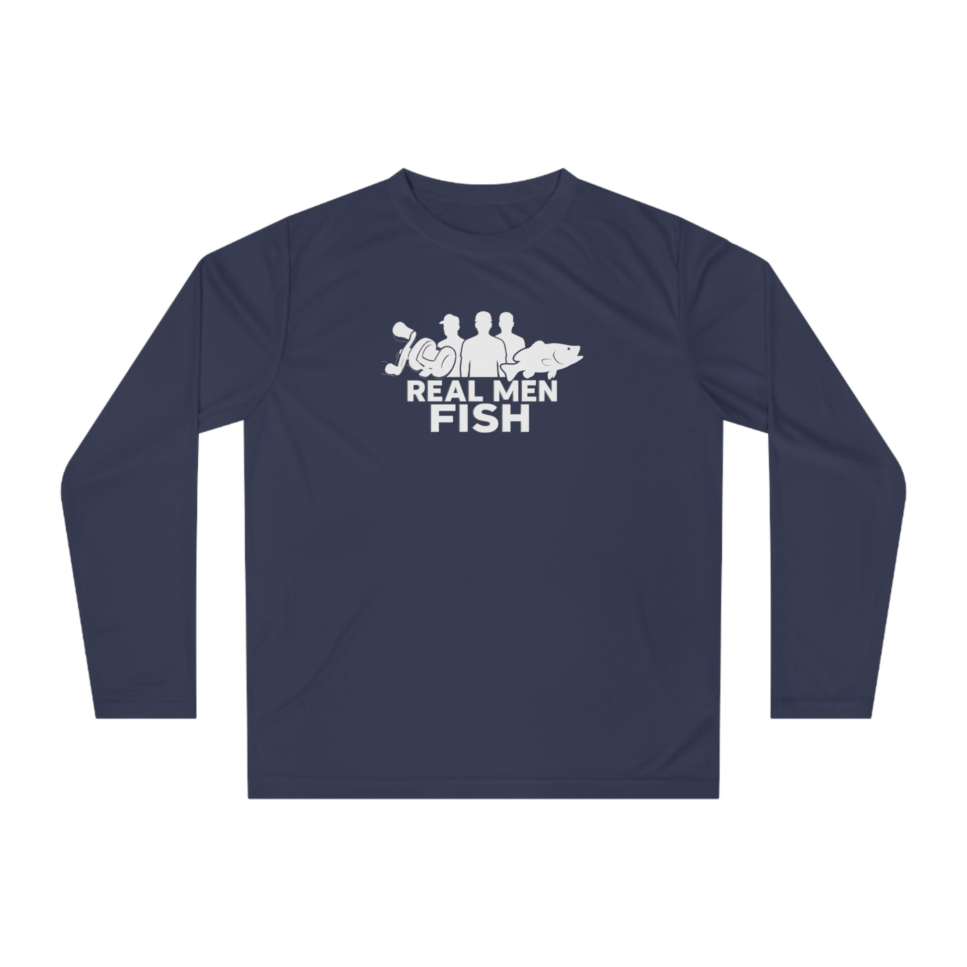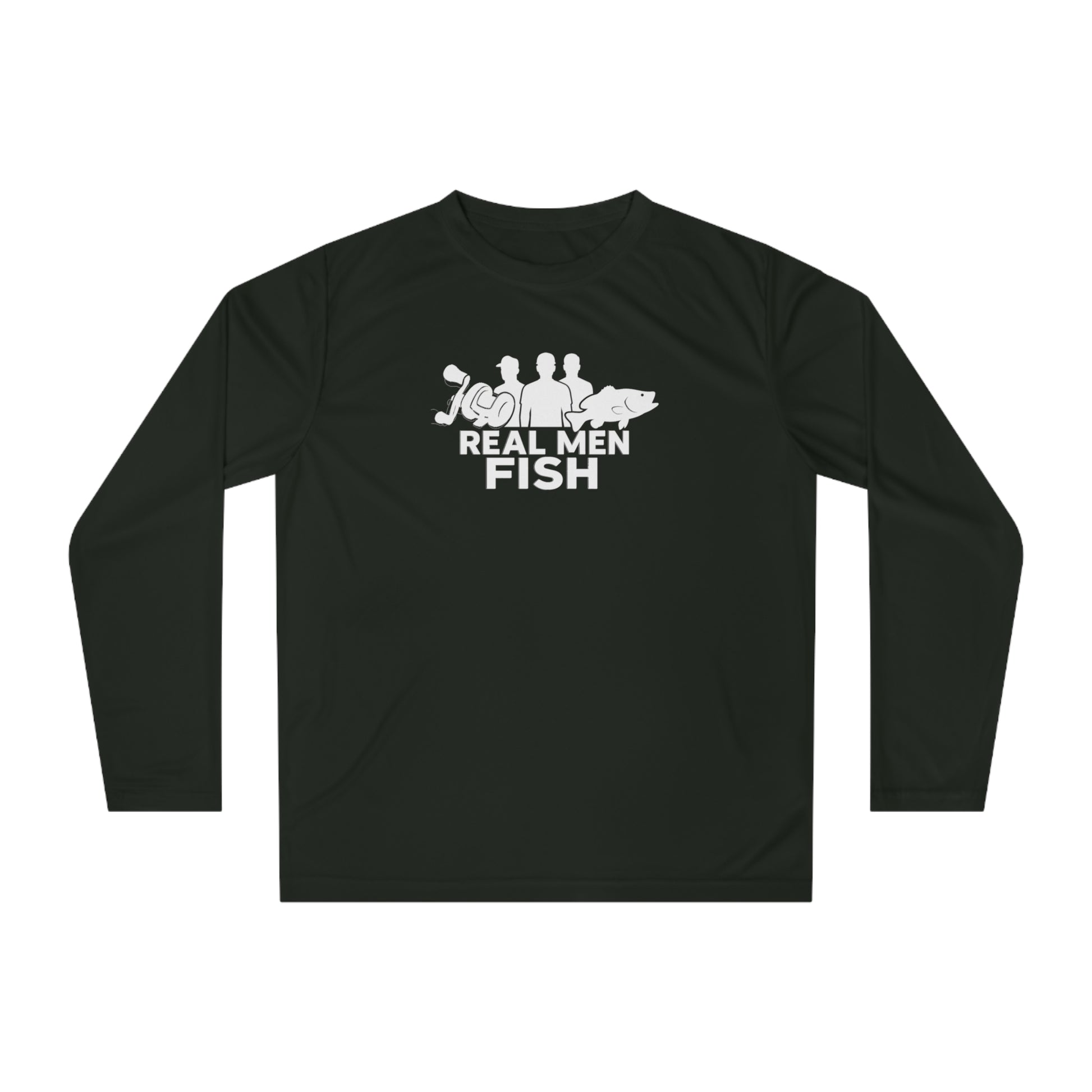 Stay cool while showing off a clever design with the Real Men Fish Performance Shirt. This moisture-wicking shirt incorporates the fun visual wordplay – featuring a fishing REEL, MEN silhouettes, and a FISH to form the phrase "REAL MEN FISH." Designed to keep you dry and comfortable on the water, it's a smart way to represent your love for fishing while staying active.