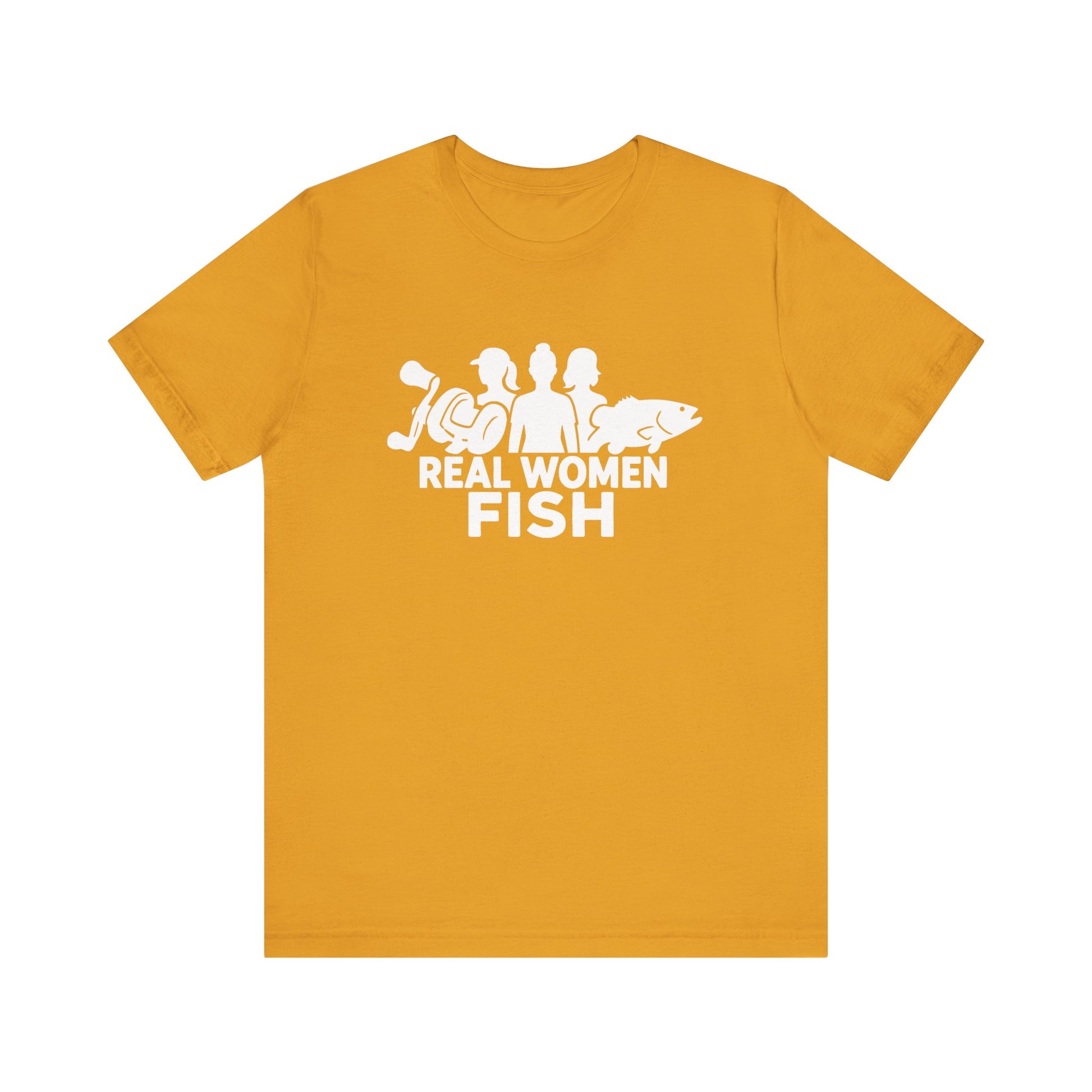 This tee makes a statement with a clever twist! Featuring a brilliant visual play on words, this design uses a fishing REEL combined with silhouettes of WOMEN and a FISH to spell out "REAL WOMEN FISH". Comfortable and empowering, this t-shirt is perfect for the woman who loves to fish and appreciates a smart, well-designed message. Show the world that Real Women Fish.